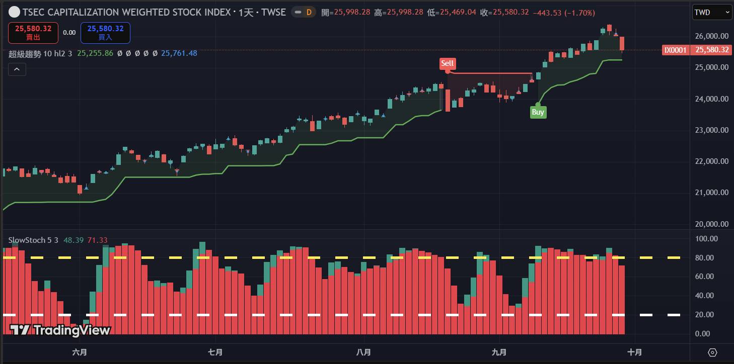 支撐觀察:今日收盤雖跌破10日線,但月線(約在25,000點附近)將是下一個重要的心理與技術支撐關卡。若能守住,則可視為強勢整理。
