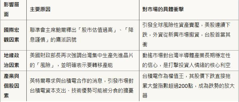 週五(9/26)台股的巨幅震盪,並非單一因素造成,而是國際宏觀情緒、地緣政治疑慮、產業特定消息三重利空匯聚的結果。下表簡要說明了各因素的影響:
