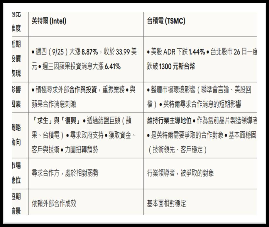 英特爾股價的強勁表現確實與它近期積極的合作洽談密切相關,而台積電的股價波動則更多是受短期市場情緒和外部環境影響。